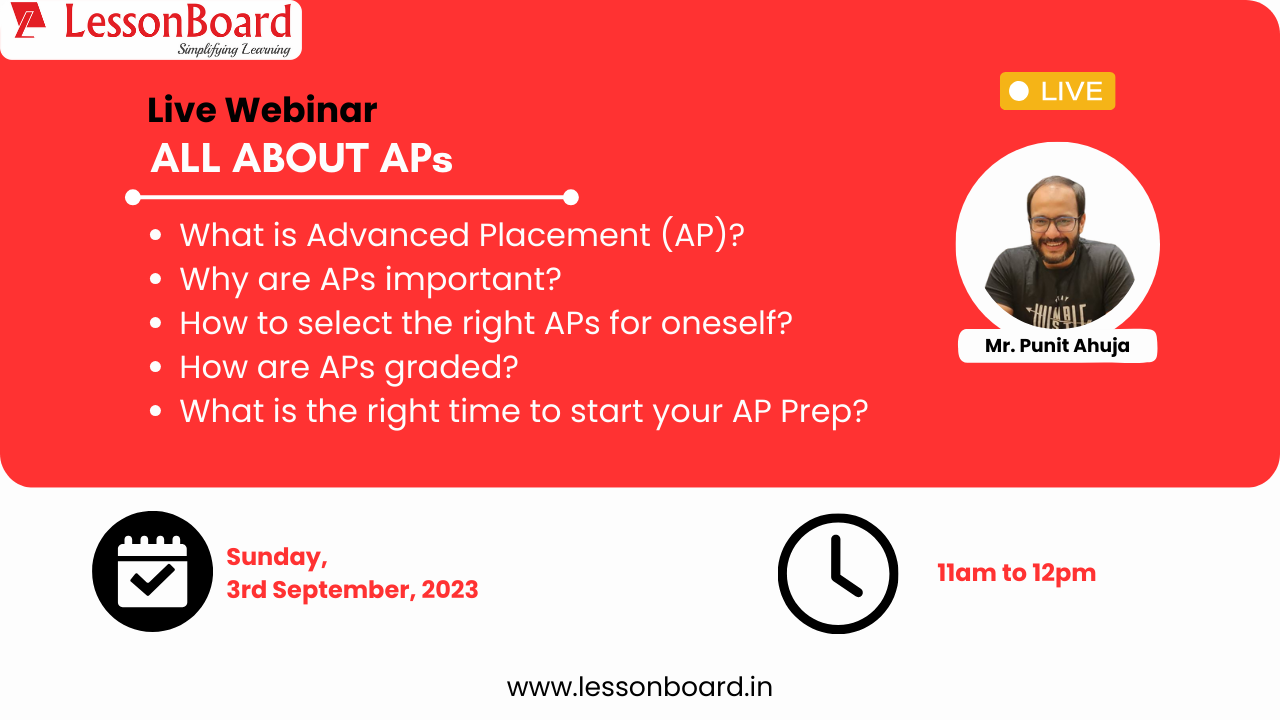 LessonBoard hosted a free webinar titled “All About APs,” led by Mr. Punit Ahuja, a seasoned educator and also the Founder & Director of LessonBoard. This insightful event covered the fundamentals of Advanced Placement (AP) courses, their significance in college admissions, guidance on choosing the right APs, the grading system, the ideal preparation timeline, and effective study strategies. The session concluded with an engaging Q&A session, where attendees had their questions answered. LessonBoard remains committed to providing valuable resources and support for students and parents navigating the world of AP courses.